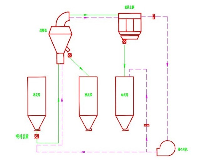 原灰經(jīng)氣力泵送入粉煤灰選粉機,經(jīng)選粉機分選后,細灰隨氣流進入在另一庫頂布置的布袋收塵器收集,經(jīng)卸灰閥至細灰?guī)臁4只覐倪x粉機粗粉口排入粗粉庫。